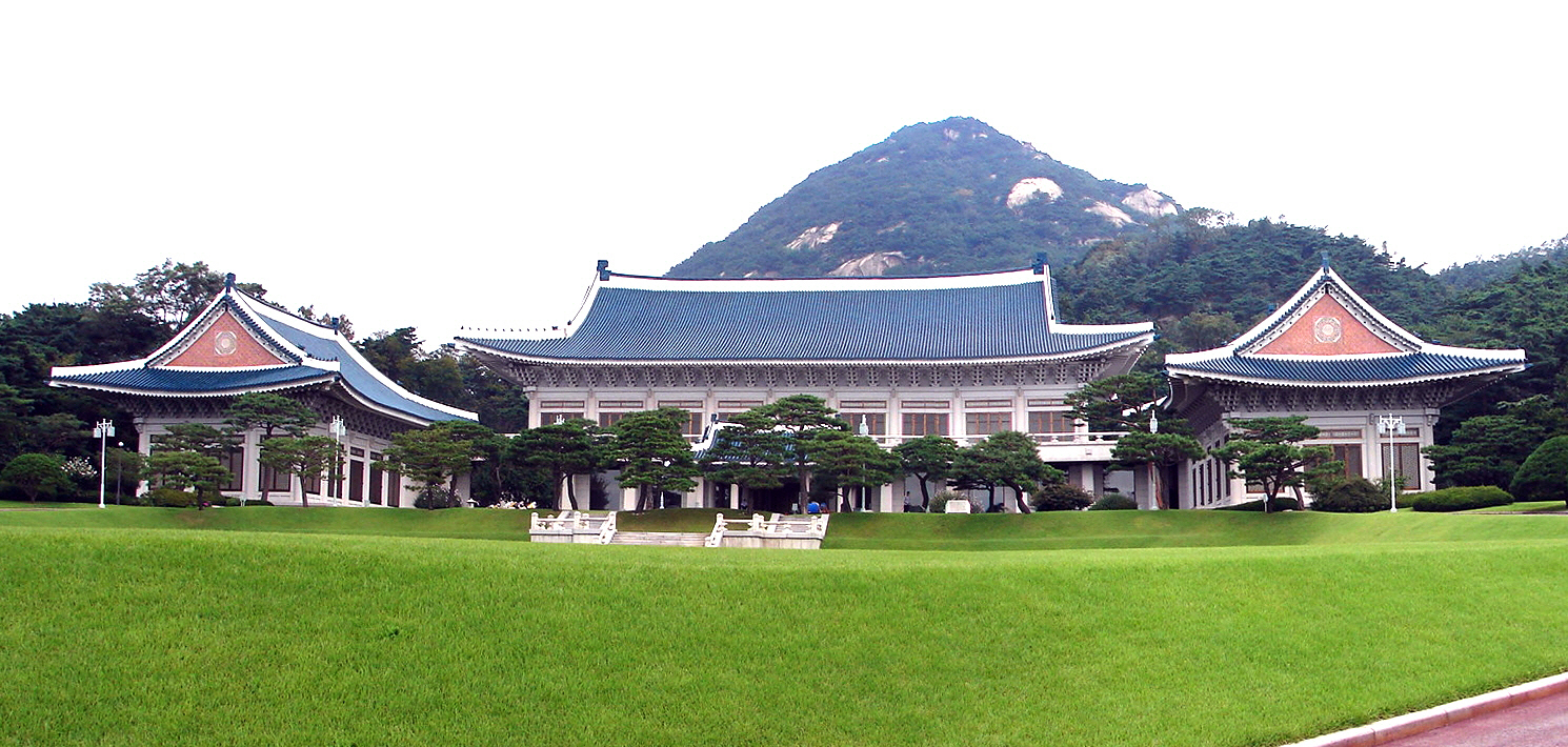 韓國(guó)政治中心青瓦臺(tái)最顯著的特征就是它的青瓦,也有人稱青瓦臺(tái)為“藍(lán)宮”,它是大韓民國(guó)的總統(tǒng)官邸及政治中心。一到青瓦臺(tái)首先看到的是主樓的青瓦。青瓦臺(tái)主樓背靠北岳山,青瓦與曲線型的房頂相映成趣,非常漂亮。